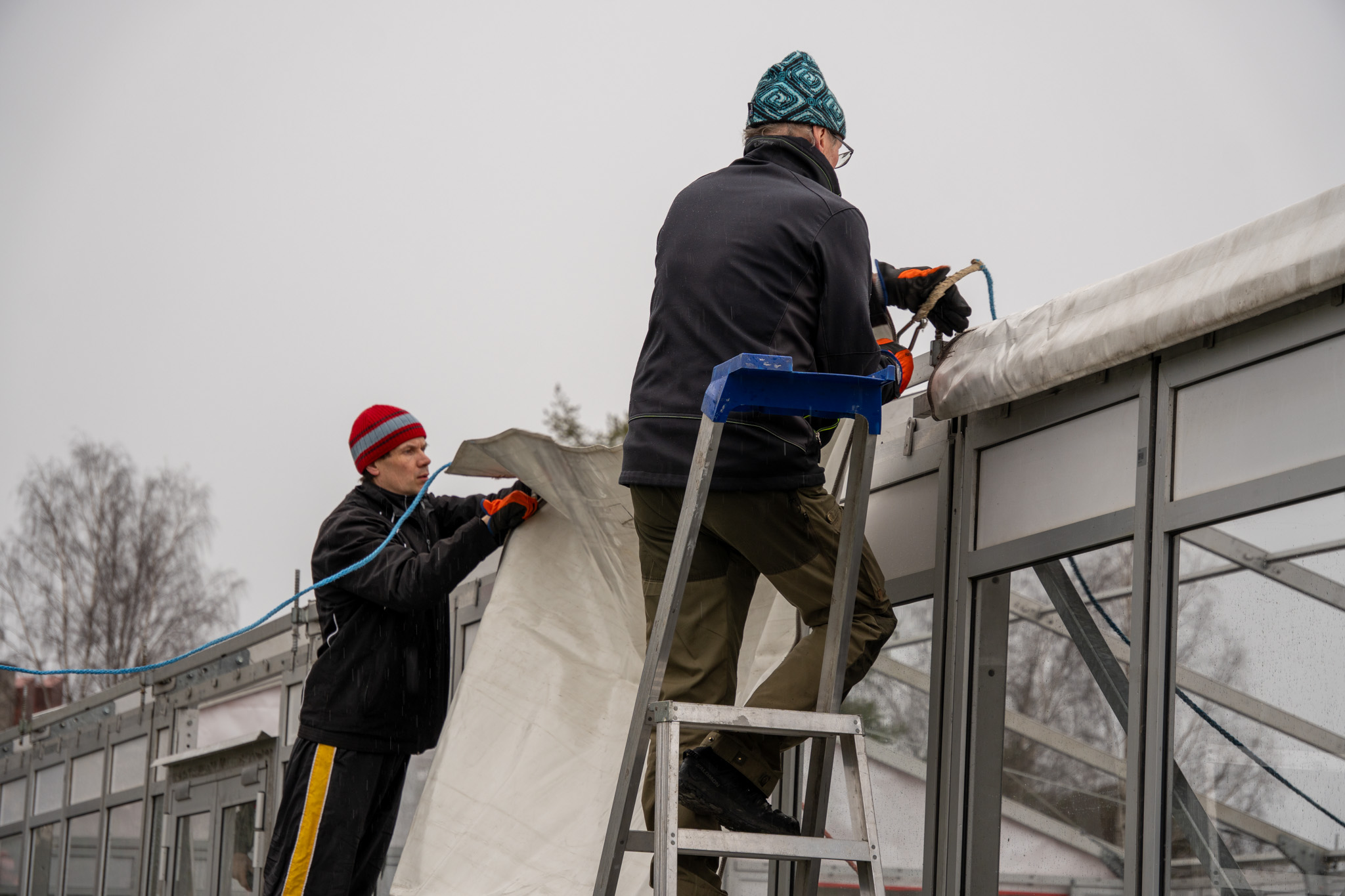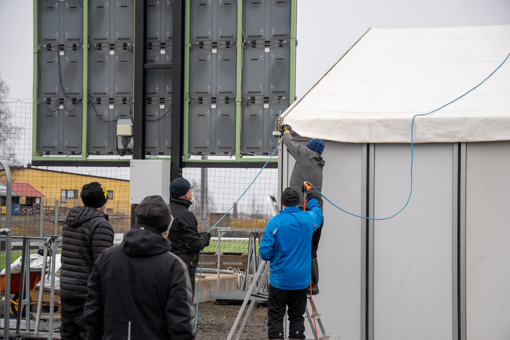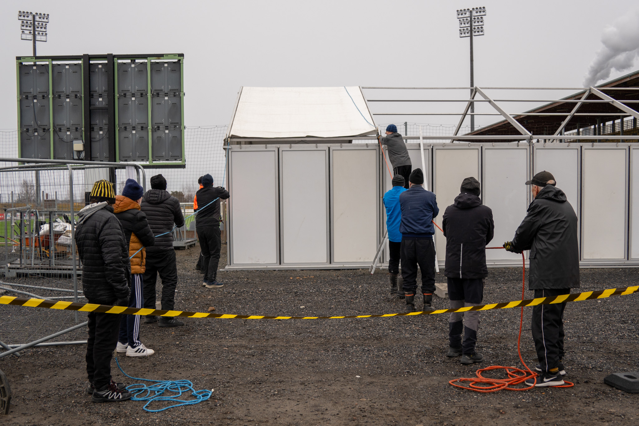 Suomen mestariseura Kuopion Palloseuran ahkera vapaaehtoisyhteisö KuPS IV vietti maanantaina ja tiistaina työntäyteistä päivää. Viikko-ohjelmassa oli jälleen perinteisen VIP-tilan pystytys, jonka pohjatyöt aloitettiin maanantaina jo eilen ja tänään oli varsinaisten rakennustöiden vuoro. Parinkymmenen henkilön suuruinen porukka kokoontui aamulla stadionille aloittaen osien asentamisen paikoilleen. Työt etenivät ripeässä tahdissa pitkäaikaisen kokemuksen ja rautaisen ammattitaidon ansiosta ja rakennusurakka valmistui muutamassa tunnissa jo puolen päivän aikoihin. Osuma Klubin viimeistely-, sisustus- ja somistamistöitä luonnollisesti jatketaan vielä tämänkin jälkeen.